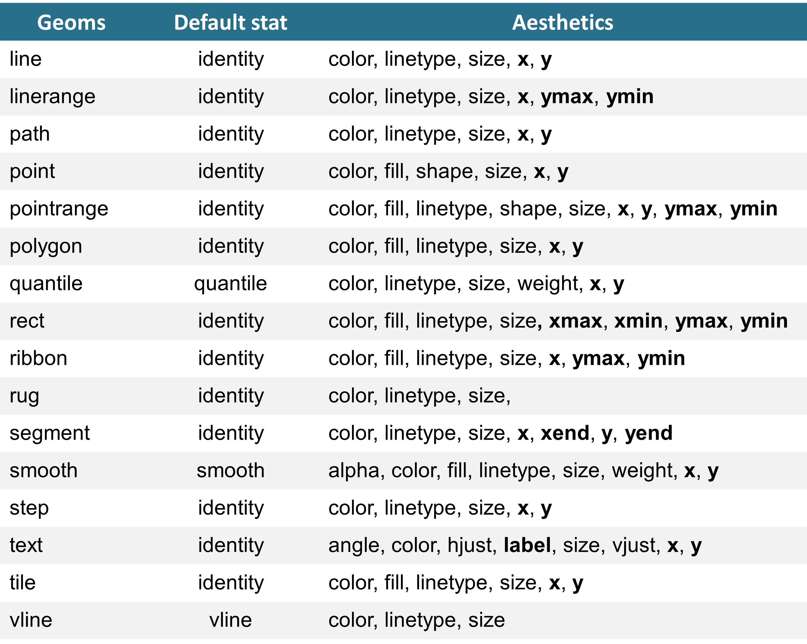 stat_smooth(geom_smooth)stat_unique(geom_point)stat_summary(geom_pointrangestat_count(geom_bar)stat_bin(geom_histogram)stat_density(geom_density)stat_boxplot(geom_boxplot)stat_ydensity(geom_violin)