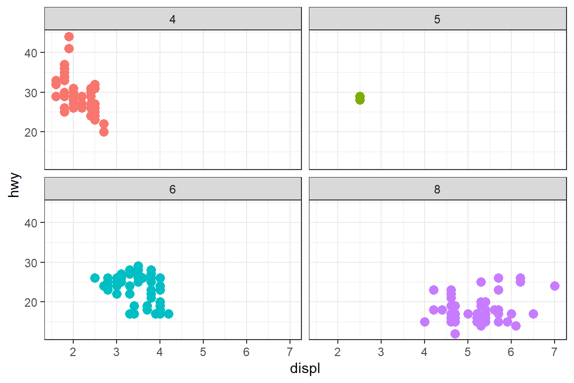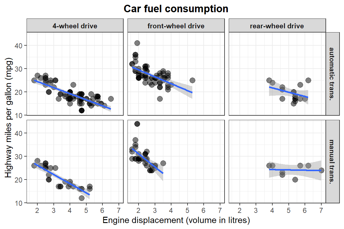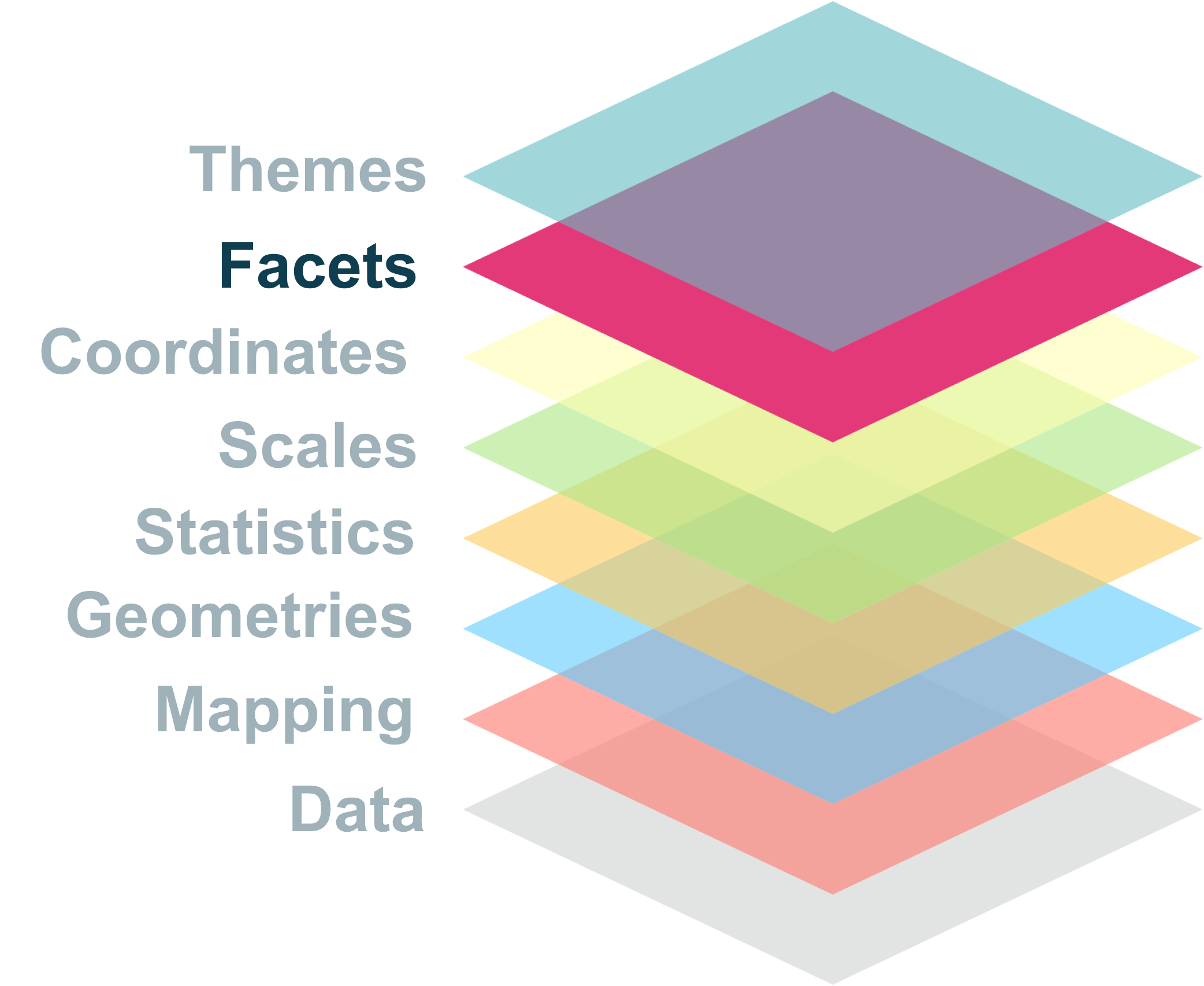 Facets divide plot into subplots based on the values of one or more discrete variables.