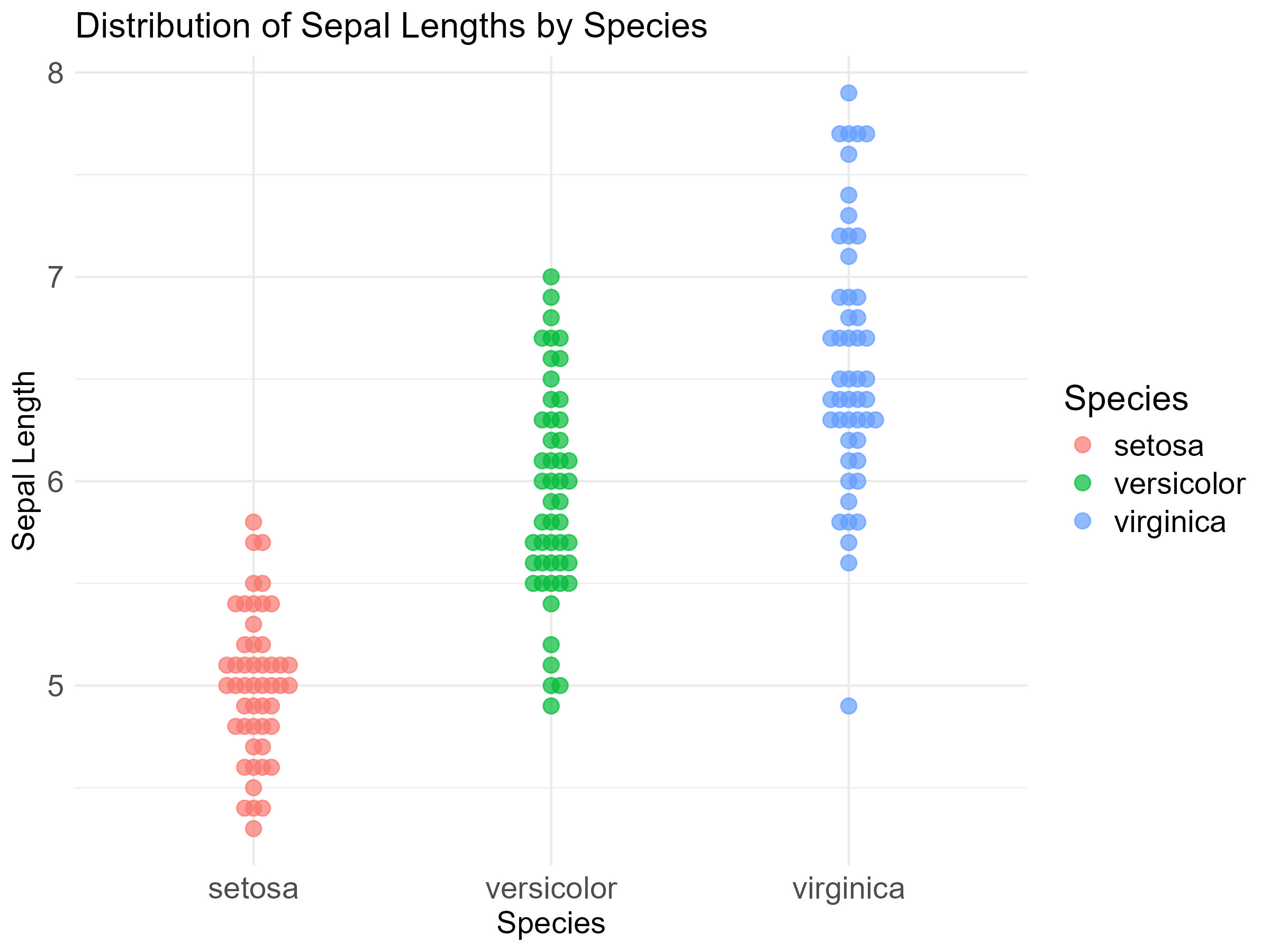 Visualize the distribution of sepal lengths across species using a beeswarm plot.