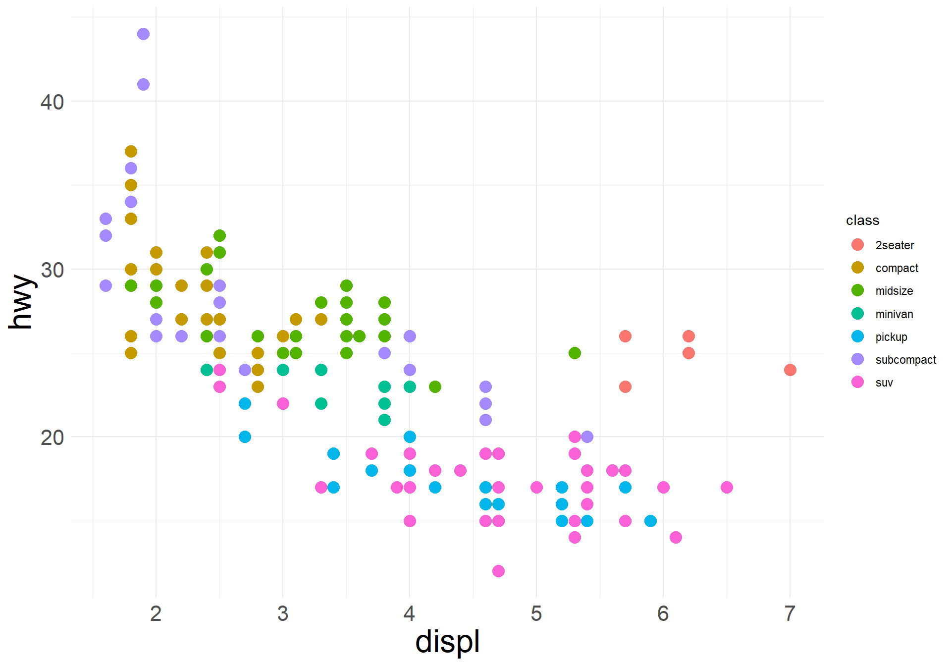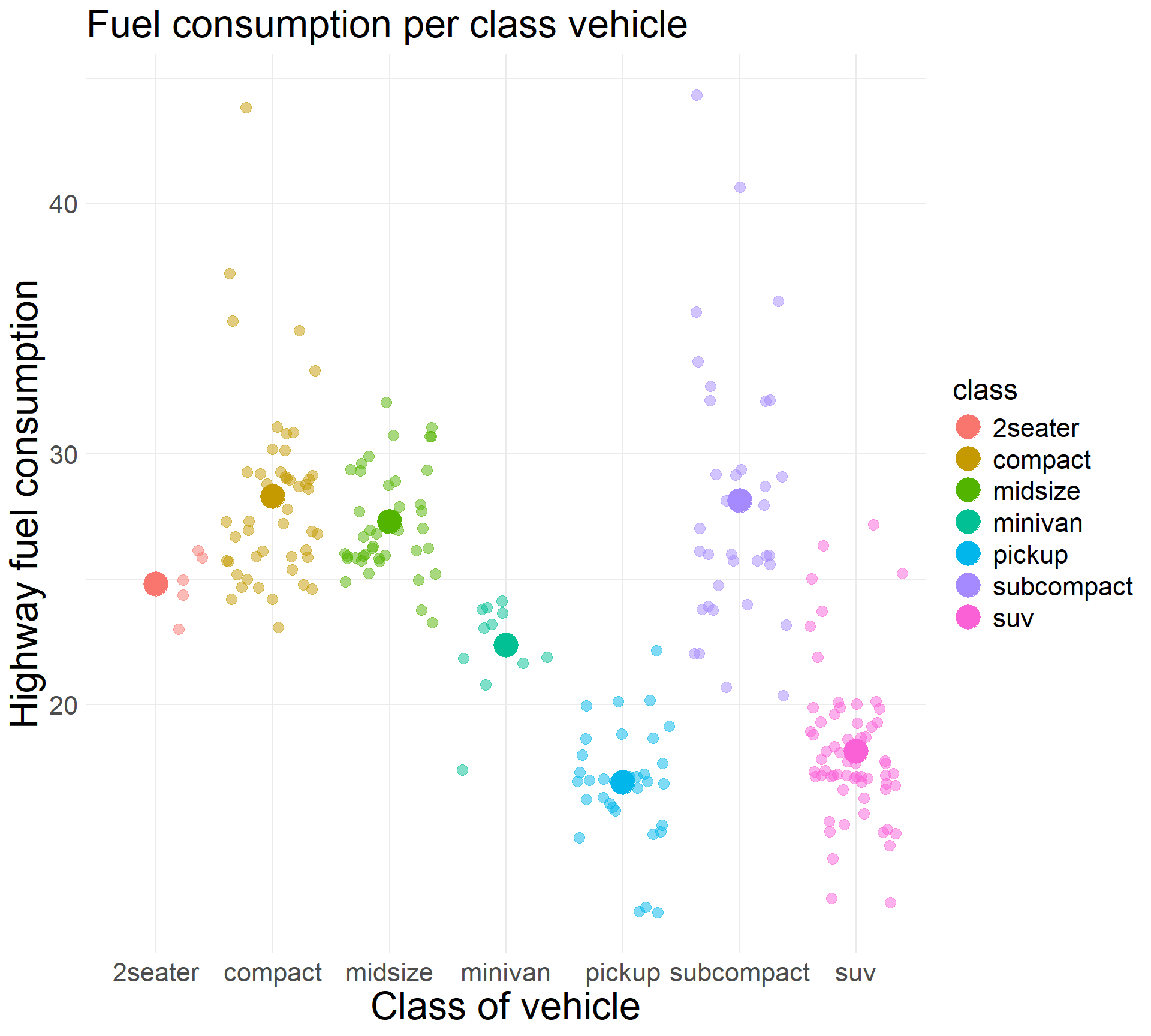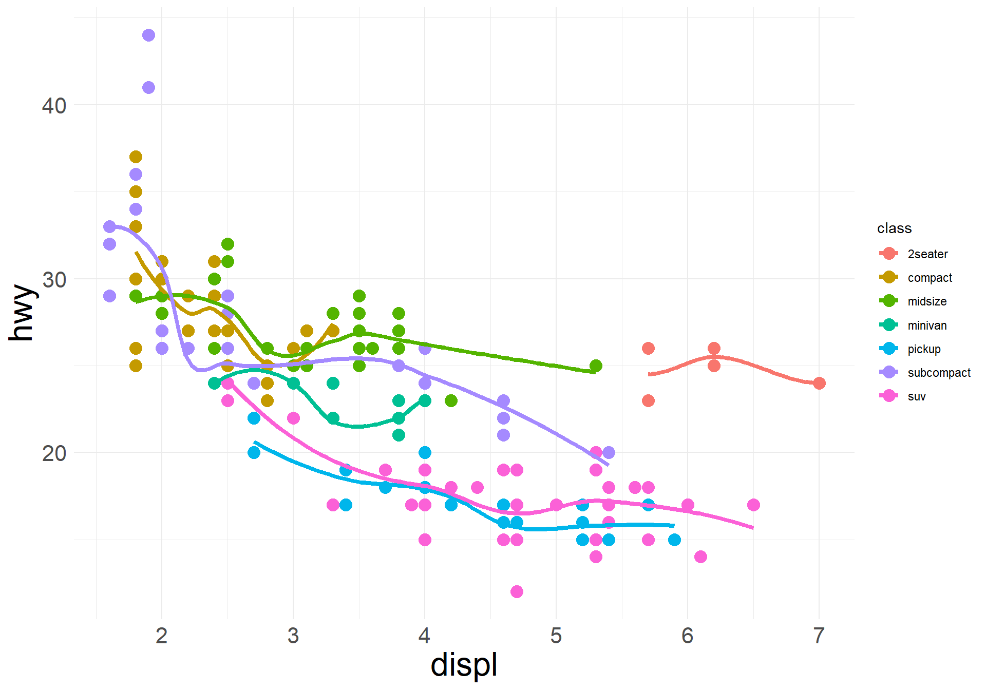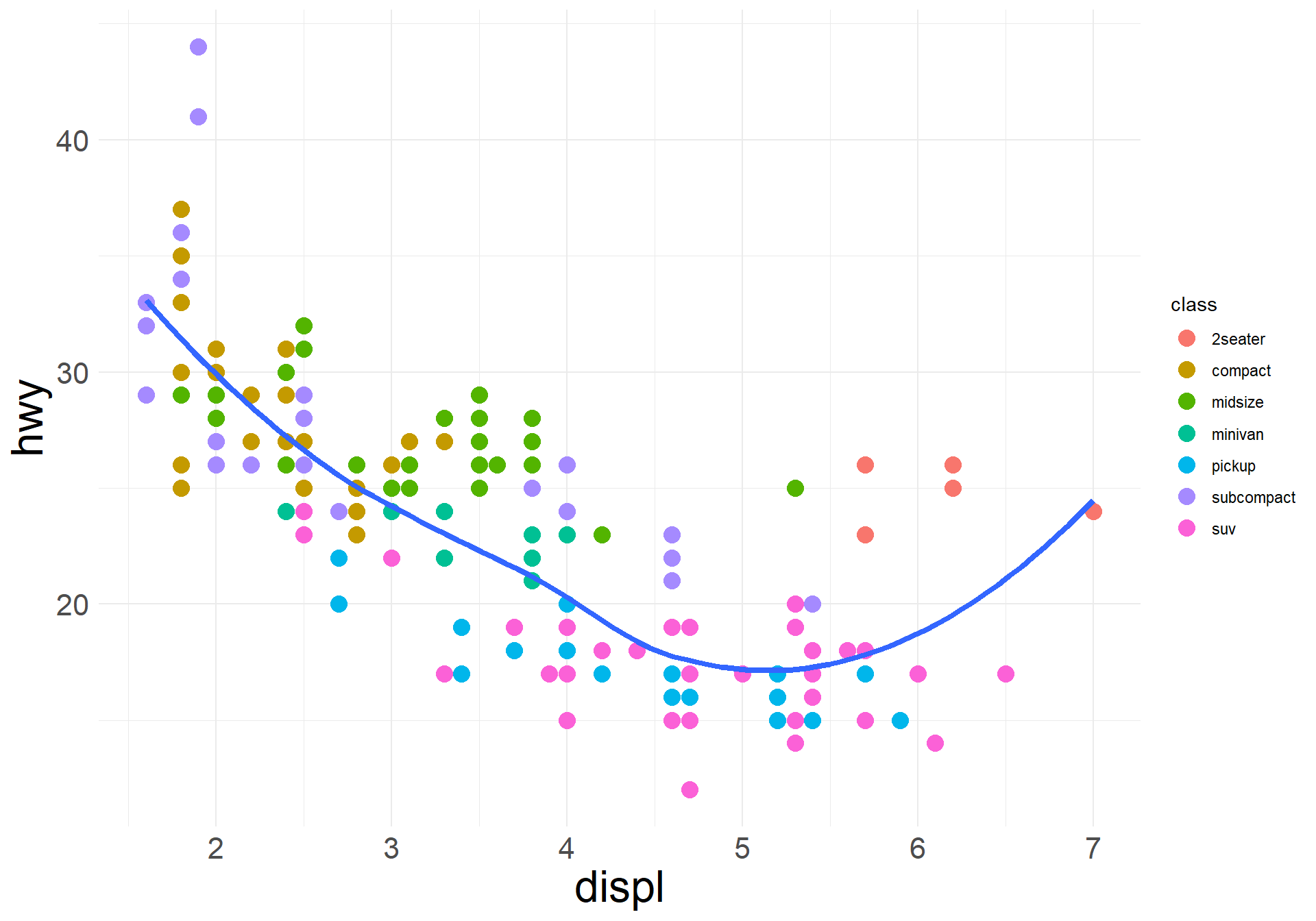 Use the mpg data to recreate the plot shown on the right. You may use the following parameters: